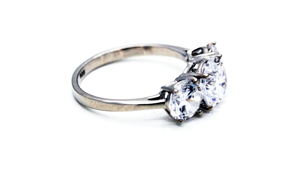 A Victorian-style 3 faux-diamond stone engagement ring.