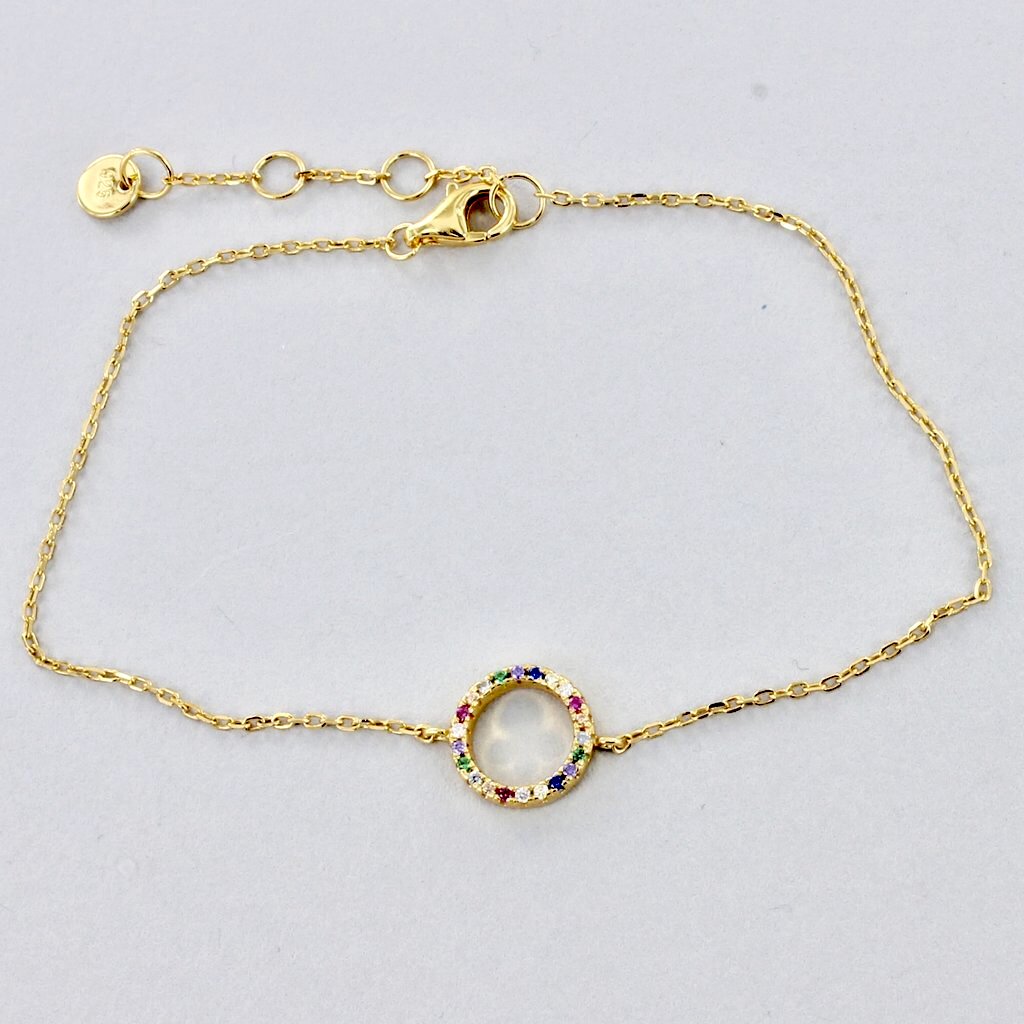 A beautifully crafted halo shaped pendant embedded with multi-coloured stones, along a fine sterling silver or gold vermeil adjustable chain to suit all wrists. This bracelet oozes elegance and sophistication and the glistening stones will add a touch of colour to any outfit, especially teamed with the matching necklace and earrings.