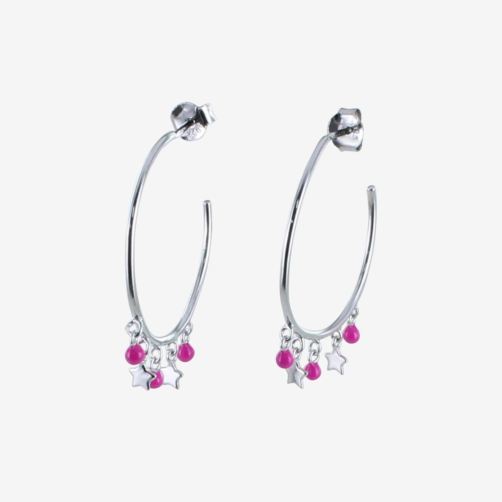 Beautifully crafted Sterling Silver or Gold Plate hoop earrings with charming high shine stars with gorgeous pink enamel beads hanging from the bottom.  The high shine finish catches the light with your every move.  These hoops are sure to be an all time favourite.
