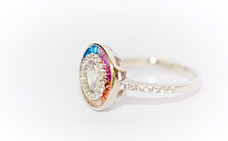 To match the gorgeous pendant and earrings in the range this rainbow multi-coloured ring is a must have jewellery box addition. Set in rhodium so there will be no tarnishing this is so easy to wear due to its flat surface.