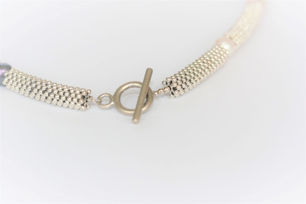 A navy, white and pink pearl everyday silver plate "links" style necklace with easy T-Bar clasp.   Length 18".