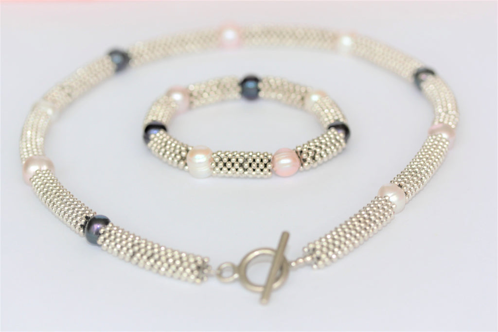 Navy, White and Pink Pearl Snake T-Bar Necklace