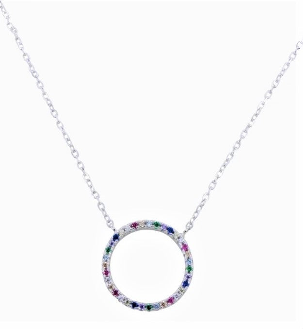 A beautifully crafted halo shaped pendant embedded with multi-coloured stones, hanging from a fine sterling silver or 18ct gold vermeil chain which is adjustable from 16 to 18 inches. This necklaces oozes elegance and sophistication and the glistening stones will add a touch of colour to any outfit, especially teamed with the matching bracelet or huggie hoop earrings. Perfect for so many occasions or everyday wear.